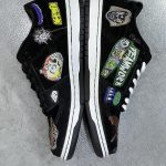 رویهی کفش از جیر مشکی ساخته شده و روی اون پچها و طرحهایی با دوخت برجسته دیده میشن — از جمجمه و خفاش گرفته تا صاعقه، شیطان و نمادهای خیابونی تاریک.